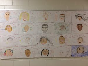 En deuxième partie du projet, en devoir, chaque élève, avec l’aide de ses parents, devait nous donner une liste de ses principales qualités. Ensuite, nous avons réalisé un autoportrait et autour du visage, nous avons ajouté les qualités.